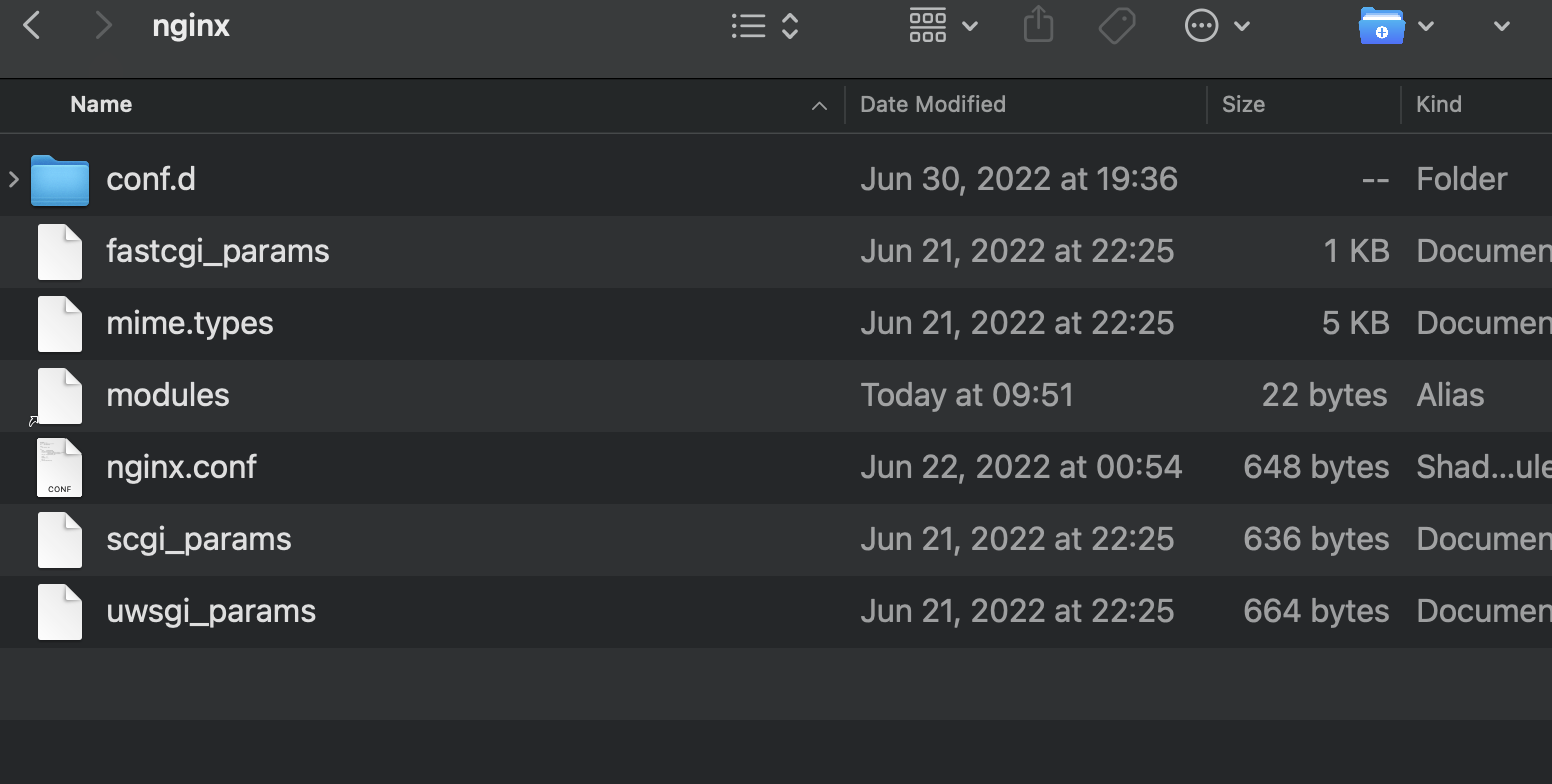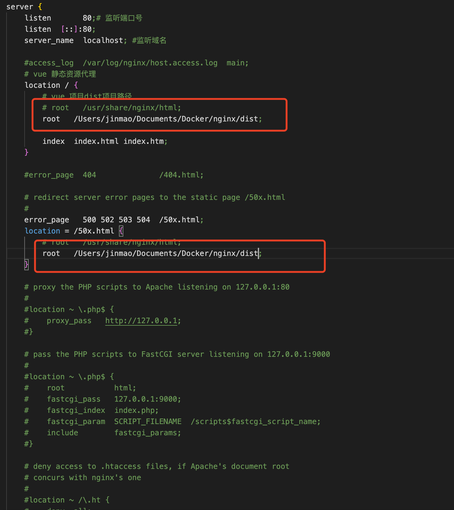 现在已经把宿主机的 vue 项目 dist 挂载到 nginx 容器中,这样监听的请求就会被 nginx 代理到对应的目录中访问资源,还有宿主机的 /Users/jinmao/Documents/Docker/nginx/nginx 也被挂载到了容器 etc/nginx 中,这样只要修改宿主机的 nginx 配置,只要重启容器最新配置就会生效。