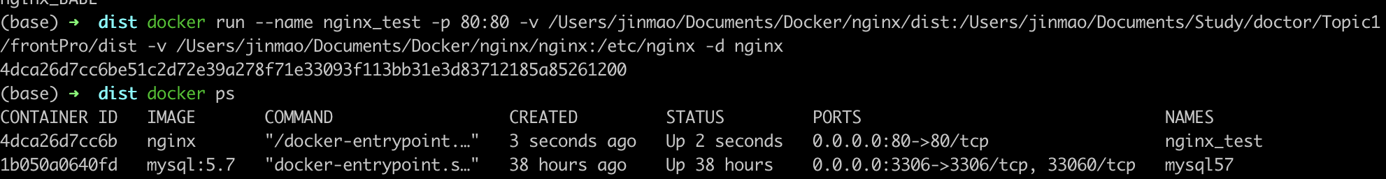 8docker run --name <name> -p 80:80 -v /Users/jinmao/Documents/Docker/nginx/dist:/Users/jinmao/Documents/Study/doctor/Topic1/frontPro/dist -v /Users/jinmao/Documents/Docker/nginx/nginx:/etc/nginx -d nginx