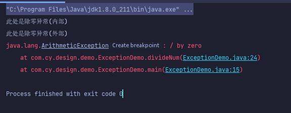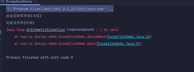 | public class ExceptionDemo { public static void main(String[] args) { try { divideNum(0); } catch (Exception e) { e.printStackTrace(); System.out.println("此处是除零异常(外部)"); } }
