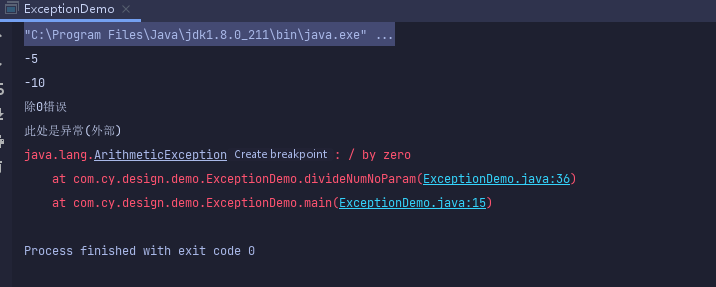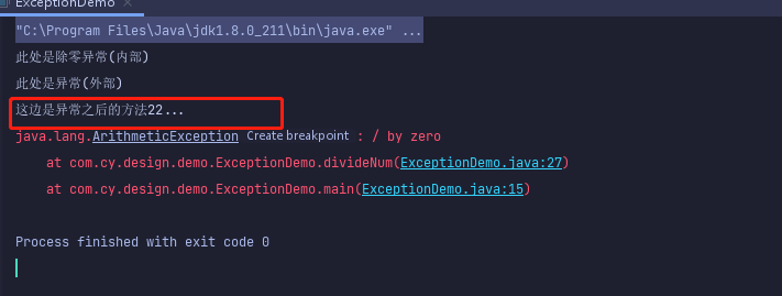 | public class ExceptionDemo { public static void main(String[] args) { try { divideNum(0); System.out.println("这边是异常之后的方法11..."); } catch (Exception e) { e.printStackTrace(); System.out.println("此处是异常(外部)"); }