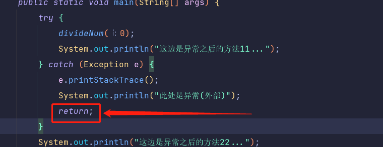 | public static void main(String[] args) { try { divideNumNoParam(); System.out.println("这边是异常之后的方法11..."); } catch (Exception e) { e.printStackTrace(); System.out.println("此处是异常(外部)"); return; } System.out.println("这边是异常之后的方法22..."); }