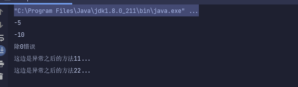 System.out.println("这边是异常之后的方法22..."); } public static void divideNum(Integer i){ try { Integer res = 10 / i; } catch (Exception e) { if (e instanceof ArithmeticException) System.out.println("此处是除零异常(内部)"); throw e; } } }
