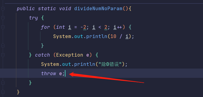 public static void divideNum(Integer i){ try { Integer res = 10 / i; } catch (Exception e) { if (e instanceof ArithmeticException) System.out.println("此处是除零异常(内部)"); throw e; } } }