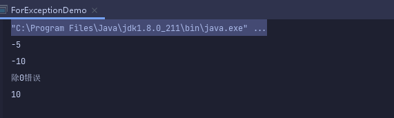 public static void divideNumNoParam(){ try { for (int i = -2; i < 2; i++) { System.out.println(10 / i); } } catch (Exception e) { System.out.println("除0错误"); } }