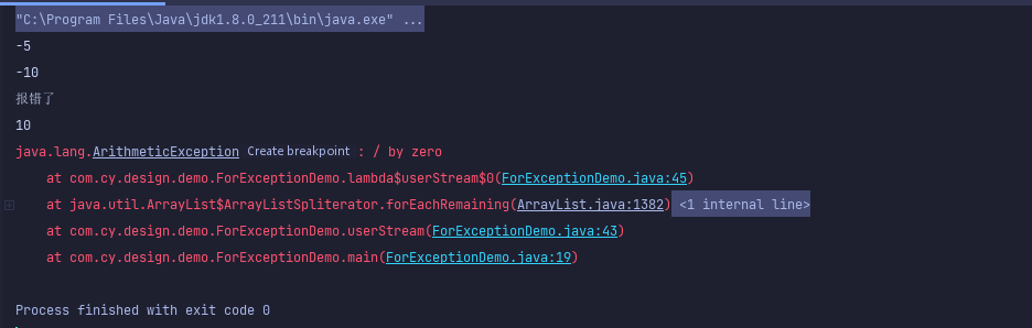 | public static void userStream(){ ArrayList<Integer> list = new ArrayList<>(); list.add(-2); list.add(-1); list.add(-0); list.add(1); AtomicInteger i = new AtomicInteger(); list.stream() .forEach(m -> { try { System.out.println(10/m); } catch (Exception e) { System.out.println("报错了"); e.printStackTrace(); } }); }