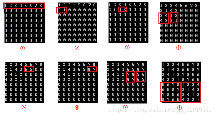 ③而 8x8 的盒子它的左上角是一个 4x4 的盒子,要填 4x4 的左下角和右下角,也分别需要知道它的右上角和左上角