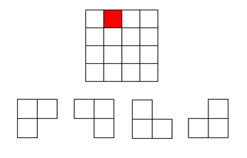 每次都对分割后的四个小方块进行判断,判断特殊方格是否在里面。这里的判断的方法是每次先记录下整个大方块的左上角方格的行列坐标,然后再与特殊方格坐标进行比较,就可以知道特殊方格是否在该块中。如果特殊方块在里面,这直接递归下去求即可,如果不在,这根据分割的四个方块的不同位置,把右下角、左下角、右上角或者左上角的方格标记为特殊方块,然后继续递归。在递归函数里,还要有一个变量 subSize 来记录边的方格数,每次对方块进行划分时,边的方格数都会减半,这个变量是为了方便判断特殊方格的位置。