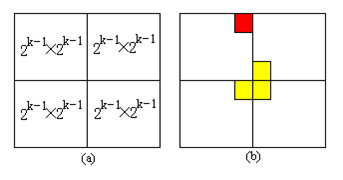 当 k>0 时,将 2^k×2^k 棋盘分割为 4 个 2^k-1×2^k-1 子棋盘 (a) 所示。特殊方格必位于 4 个较小子棋盘之一中,其余 3 个子棋盘中无特殊方格。为了将这 3 个无特殊方格的子棋盘转化为特殊棋盘,可以用一个 L 型骨牌覆盖这 3 个较小棋盘的会合处,如 (b) 所示,从而将原问题转化为 4 个较小规模的棋盘覆盖问题。递归地使用这种分割,直至棋盘简化为棋盘 1×1 。