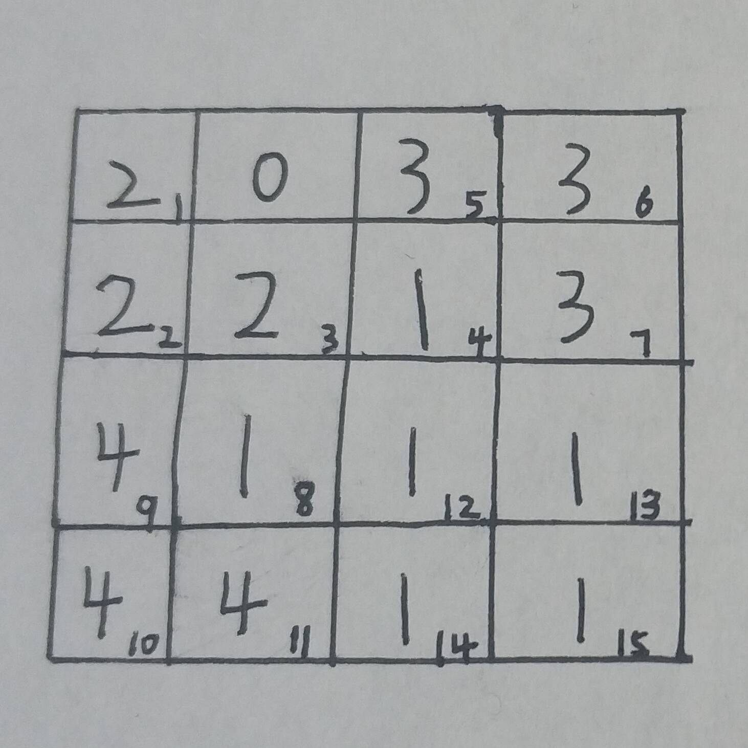 ④现在递归到 4x4 的盒子的左上角,是一个 2x2 的盒子,它不需要递归了,直接沿对角线填左下角和右下角的数字,也就是上面的图②