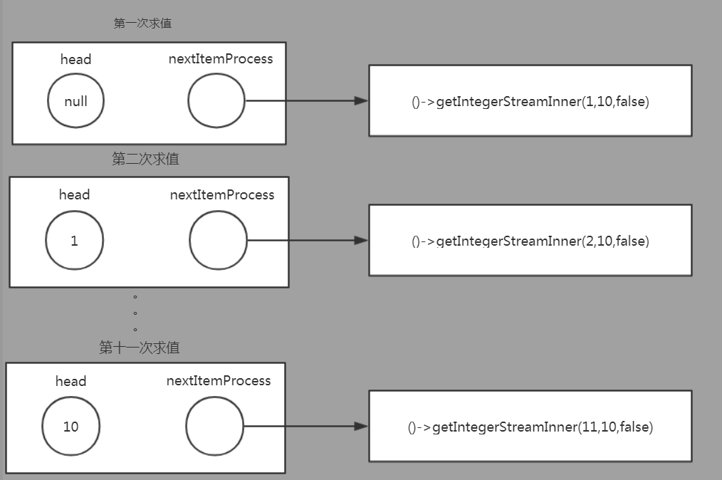 if(isStart){ return new MyStream.Builder<T>() .nextItemEvalProcess(new NextItemEvalProcess(()-> getListStream(iterator,false))) .build(); }else{ return new MyStream.Builder<T>() .head(iterator.next()) .nextItemEvalProcess(new NextItemEvalProcess(()-> getListStream(iterator,false))) .build(); } } }