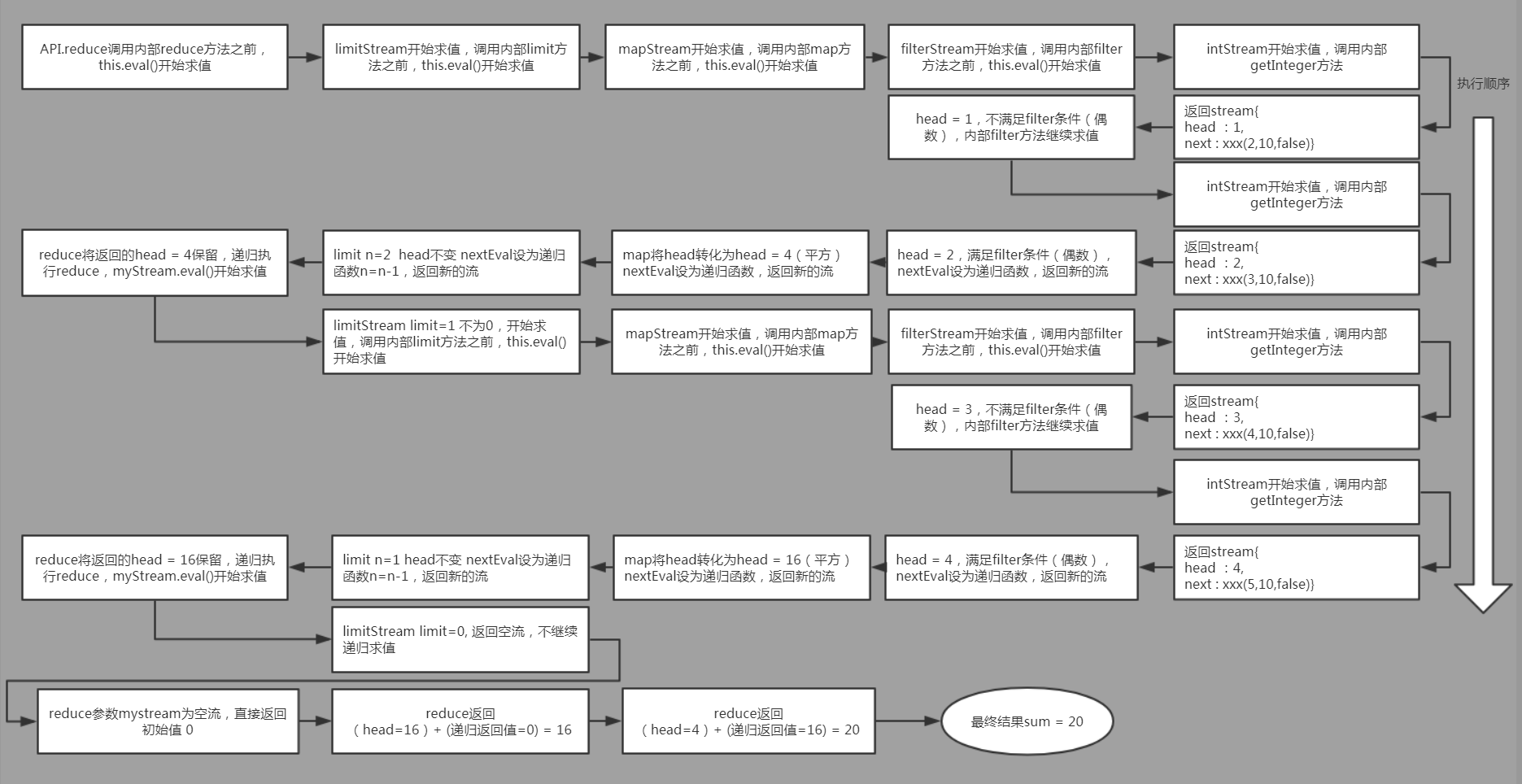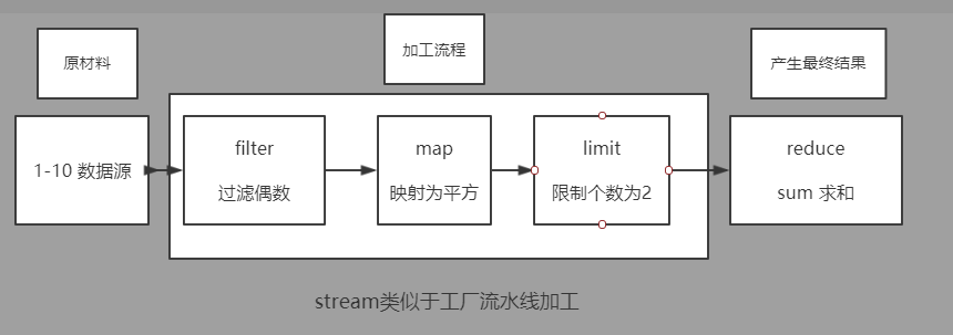 | public static void main(String[] args){ Stream<Integer> intStream = IntegerStreamGenerator.getIntegerStream(1,10); Stream<Integer> filterStream = intStream.filter(item-> item%2 == 0); Stream<Integer> mapStream = filterStream.map(item-> item * item); Stream<Integer> limitStream = mapStream.limit(2); Integer sum = limitStream.reduce(0,(i1,i2)-> i1+i2);