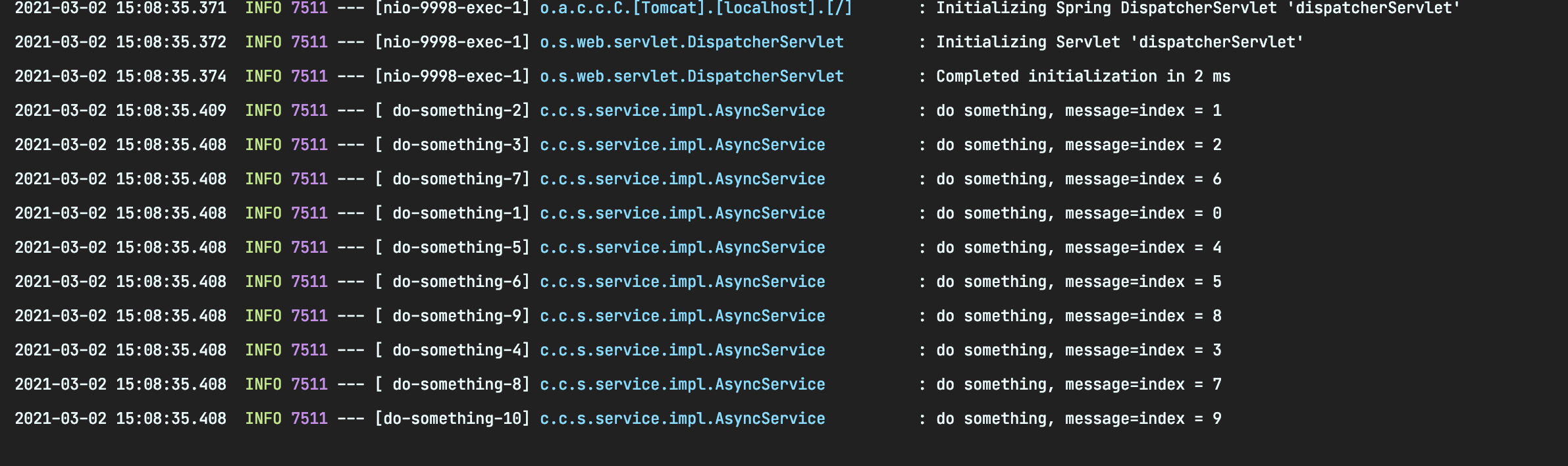 @GetMapping("/open/something") public String something() { int count = 10; for (int i = 0; i < count; i++) { asyncService.doSomething("index = " + i); } lon return "success"; } }