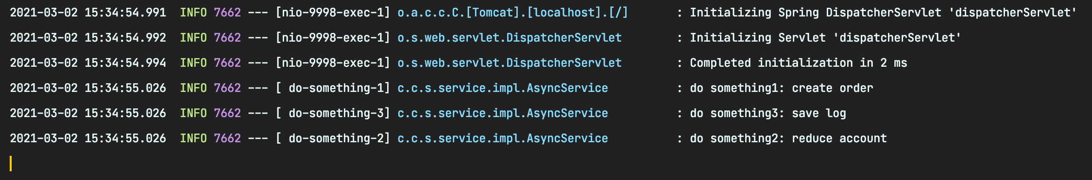 @Async("doSomethingExecutor") public CompletableFuture<String> doSomething2(String message) throws InterruptedException { log.info("do something2: {}", message); Thread.sleep(1000); return CompletableFuture.completedFuture("; do something2: " + message); }